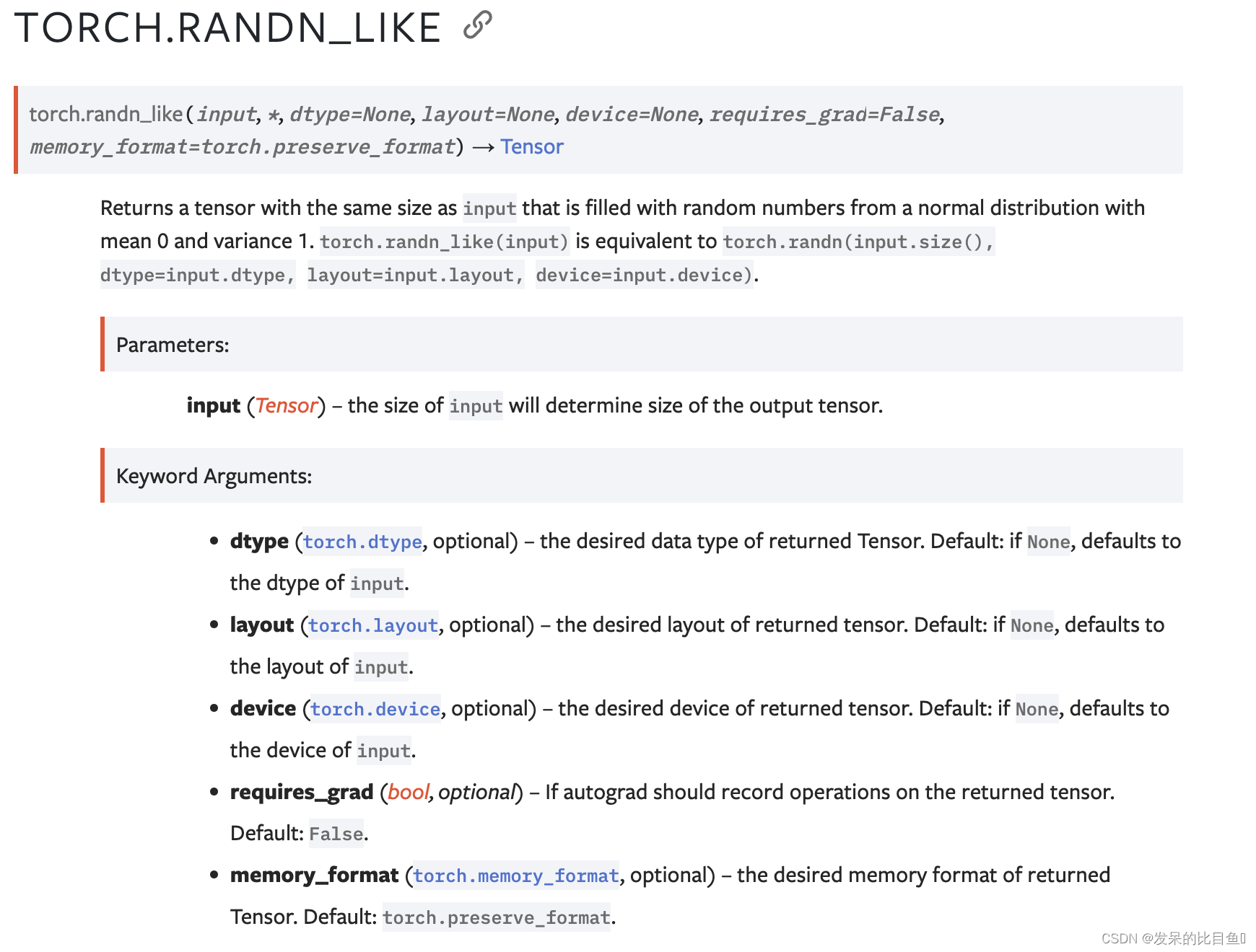 返回一个与输入大小相同的张量,该张量由均值为0、方差为1的正态分布中的随机数填充。torch.randn_like(input)等同于torch.randn(input.size(),dtype=input.dtype,layout=input.layout,device=input.device)。